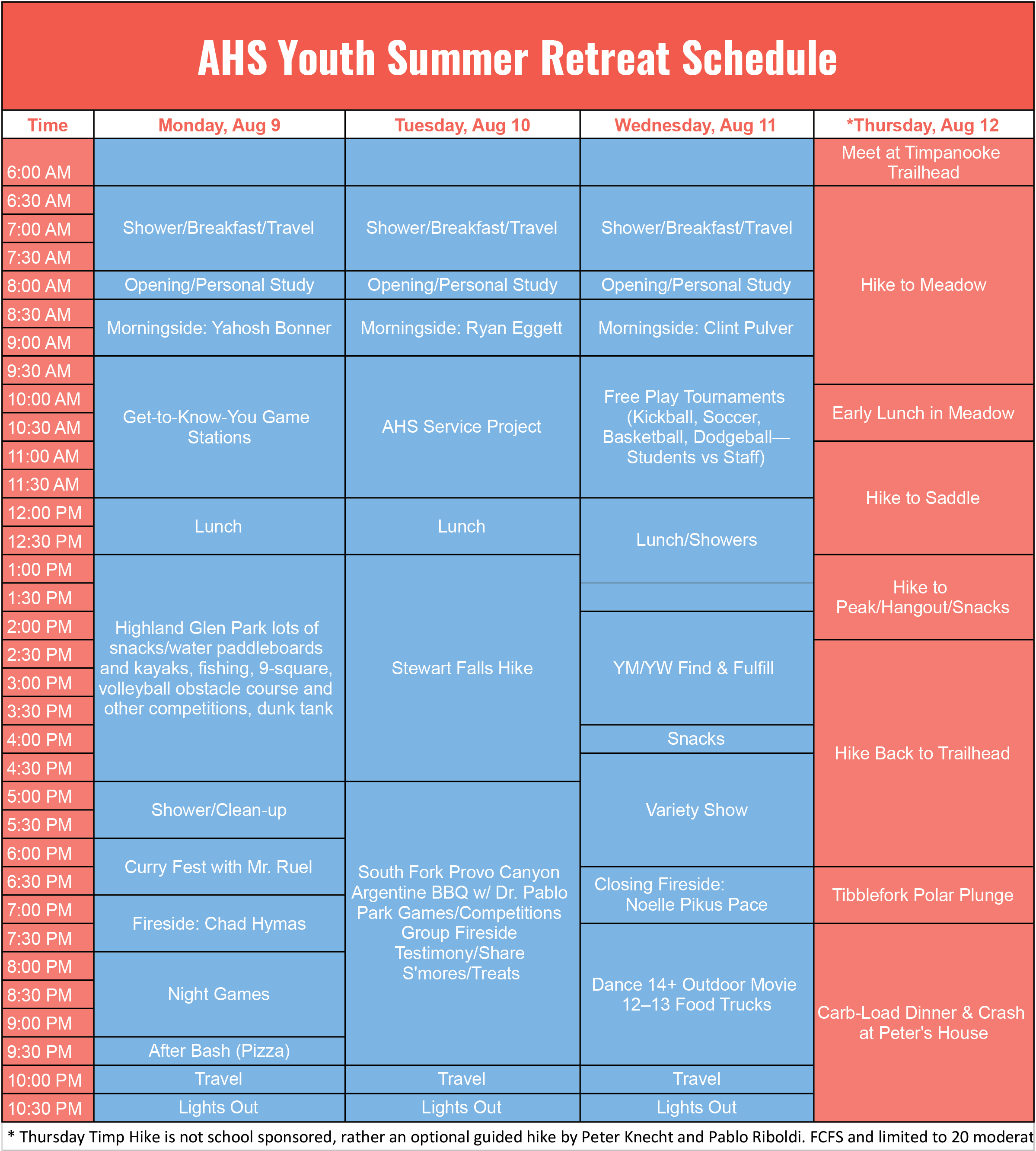 Students from out of state will slumber party with other youth at local AHS host family's homes. All meals, snacks, retreat t-shirt, reservations, etc. are included. Please see the event schedule for more details!